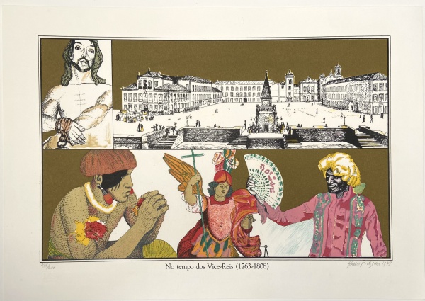 • GLAUCO RODRIGUES - "No tempo dos Vice-Reis (1763-1808)". Litografia, do álbum "Rio de Janeiro" editado pela Ymagos. Ed.135/200. 1979. MI: 27 x 42cm. ME: 35 x 50cm. Ass. inf. dir. Sem moldura.