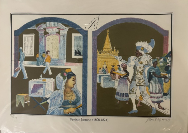 • GLAUCO RODRIGUES - "Período Joanino (1808-1821)". Litografia, do álbum "Rio de Janeiro" editado pela Ymagos. Ed.135/200. 1979. MI: 27 x 42cm. ME: 35 x 50cm. Ass. inf. dir. Sem moldura.