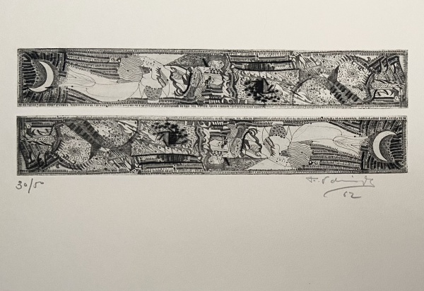 • FERNANDO ODRIOZOLA - Gravura em metal para o livro "Primeiros Poemas da Vida Maior" de Raulita Guerra Odriozola. Ed.30/50. 1962. MI: 10 x 30cm. ME: 52 x34,5cm. Ass. inf. dir. Sem moldura.