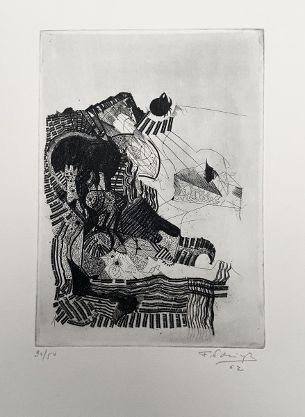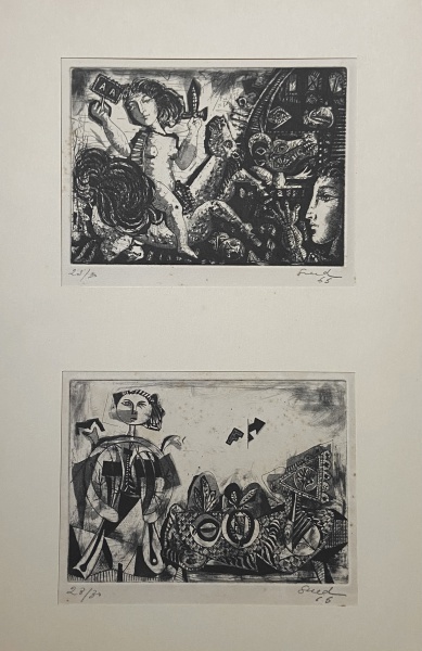 • EDUARDO SUED - 2 gravuras em metal, do álbum "25 gravuras", editado em1964-1965. Montagem original: 50,3 x 40cm. Ed.23/30. Ano:1965. Sem moldura. No. 18: Ariane - MI: 13 x 18cm. ME: 23 x 25 cm. Ass. inf. dir. No. 19: corpos Solúveis - MI: 13 x 18cm. ME: 19,5 x 23 cm. Ass. inf. dir.