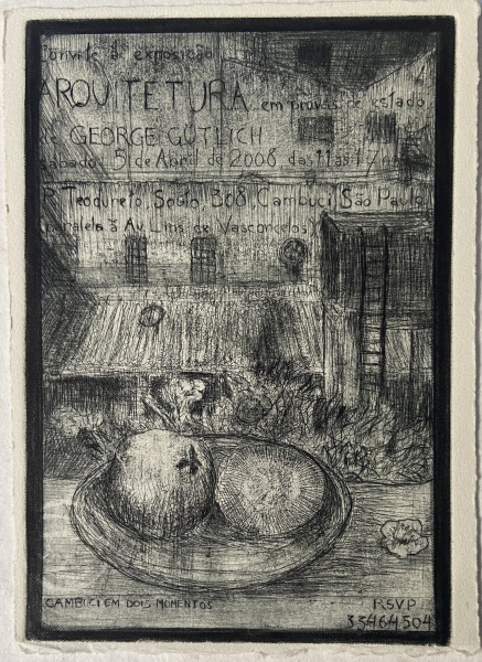 • GEORGE GUTLICH - Gravura em metal. Convite à exposição 'Arquitetura em prova de estado' em 5 de abril, 2008. ME: 15,5 x 21cm. Ass. sup. dir. Sem moldura.