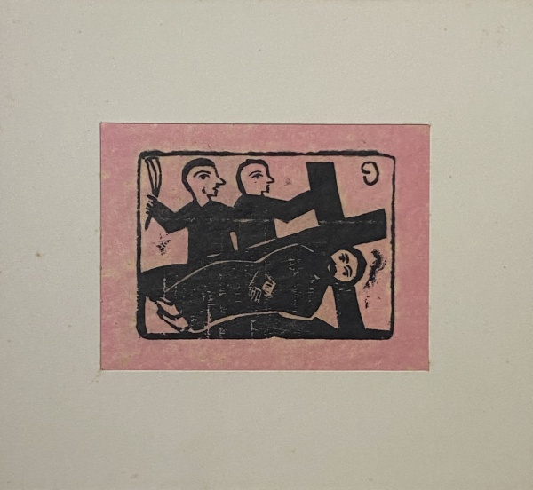• MESTRE NOZA - Xilogravura número 9 de Mestre Noza do álbum "Via Sacra" em papel de arroz, da montagem original em sanduiche de passe-partout. Editado por Julio Pacello. MI: 10,5 x 14cm, ME: 21 x 23cm. Sem moldura.